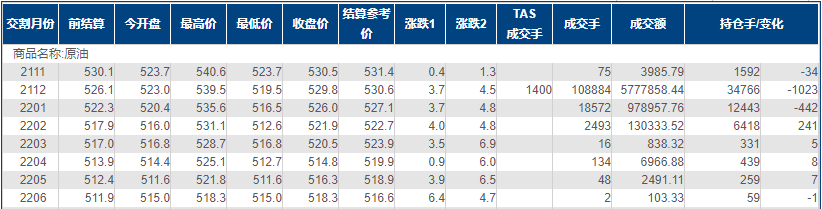 上海原油价格上涨,主力合约2112终盘收于529.8元/桶,涨3.7元/桶,涨幅0.7%。