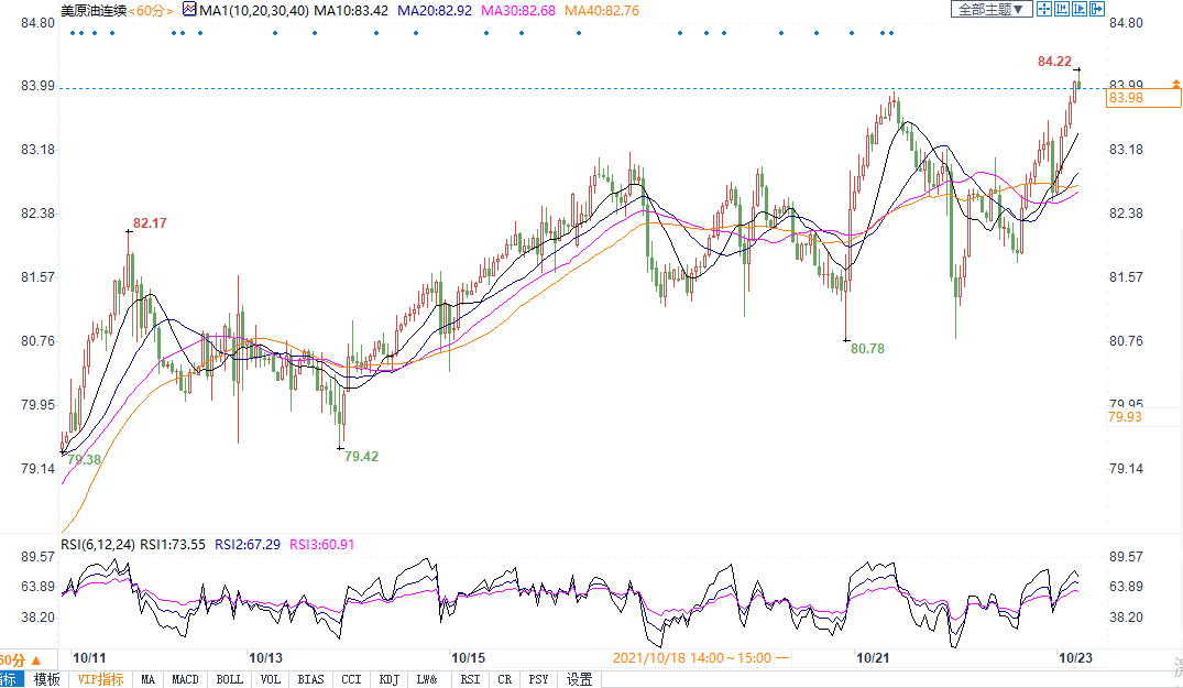 周五(10月22日)美油尾盘上涨1.48美元,涨幅为1.79%,报收83.98美元/桶,本周累计上涨1.8%,创出2015年以来最长连续上涨周数。布油上涨1.16美元,报收85.77美元/桶。该指标原油周四触及86.10美元的三年高位,本周上涨1%,为连续第七周收高。由于OPEC及其盟国再次未能达到其产量目标,在全球从冠状病毒疫情中复苏之际加剧了供应短缺,以及美国俄克拉荷马州库欣储存中心的原油库存处于低位,这在本周给油价带来支撑。