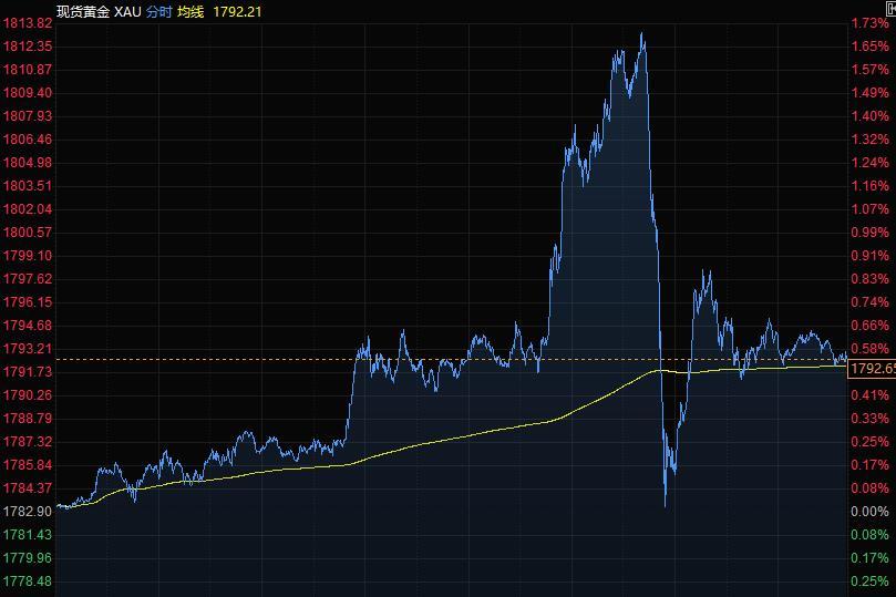 周五现货黄金冲高回落,收报1792.65美元/盎司,稍早一度大涨1.73%触及1813.82美元/盎司,为9月7日以来最高水平;此前美联储主席鲍威尔表示,他预计明年通胀将有所缓解,且美联储势将开始缩减刺激计划。