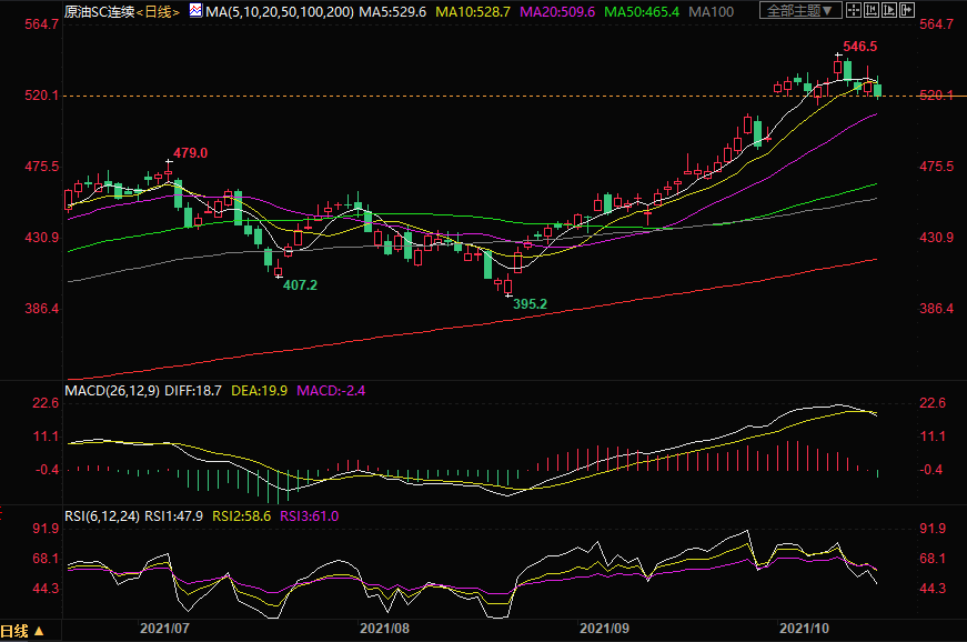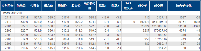 上海原油价格下跌,主力合约2112终盘收于520.2元/桶,跌10.4元/桶,跌幅1.96%。