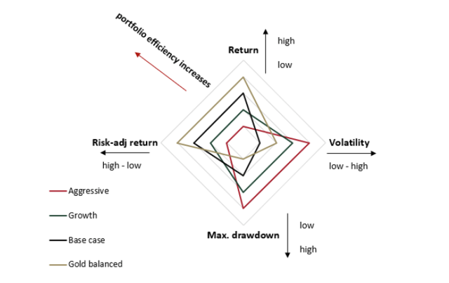 分析显示,增持股票可能不是改善投资组合业绩的最佳方式,尤其是考虑到股票的集中度已经很高。根据历史数据分析证明,投资组合中黄金的存在极大地提高了回报率并降低了风险。