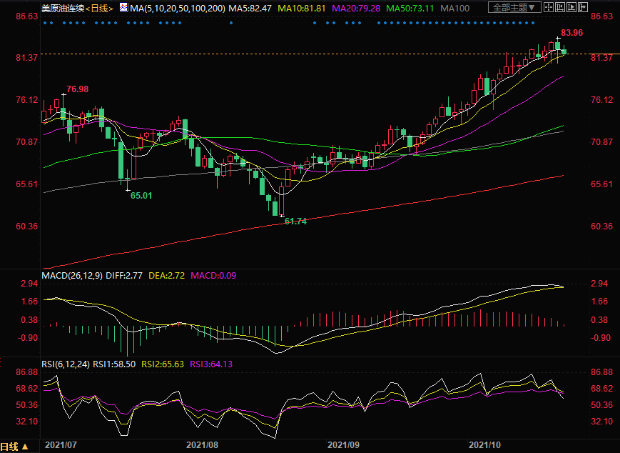 周五(10月22日)美原油小幅下跌,短线原油可能遭到获利了结盘的抛售,但整体趋势仍然偏上行,建议保守者观望,激进者等待回调后做多。