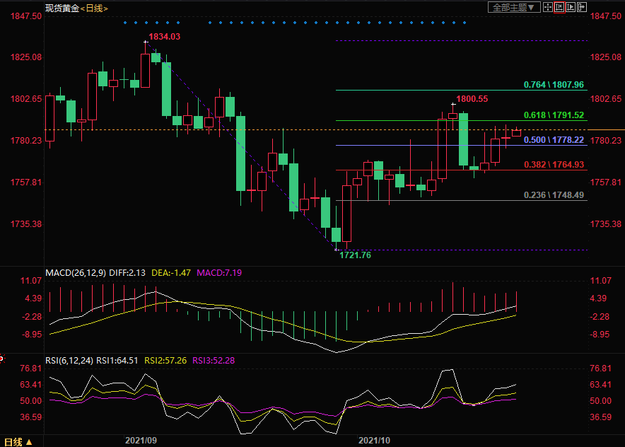 周五(10月22日)现货黄金小幅上涨,短线金价走势主要以震荡偏强运行为主,建议保守者观望,激进者可背靠1791做空。