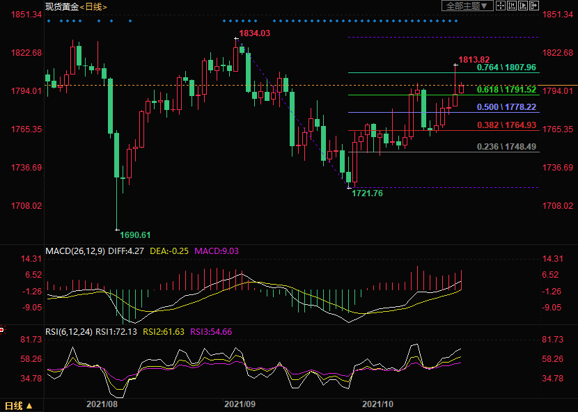 周一(10月25日)现货黄金小幅上涨,短线金价仍有望继续上涨,建议投资者在突破1800关口后继续做多。