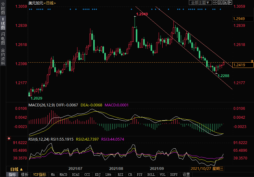 在进入关键事件风险之前,美元兑加元在阻力位上下波动,阻力位为从9月波动高点延伸的下降通道的顶部边界。如果加拿大央行的态度不那么强硬,应该会允许该货币对突破上述障碍,并向非常重要的200日移动均线发起挑战,目前该移动均线位于关键心理关口1.2500附近。