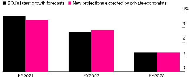 预计日本央行将调降今年的增长预期,并上调2022财年的增长预期
