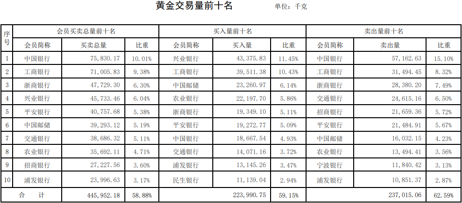 铂金交易方面,中国工美占据榜首位置,买入量达408千克,占比45.89%,上海贺利氏第二,有研亿金第三。