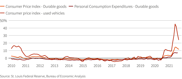 价格上涨最快的一部分商品,已经开始回落,例如二手车等。但PCE数据显示更广泛的耐用品价格仍在上涨。