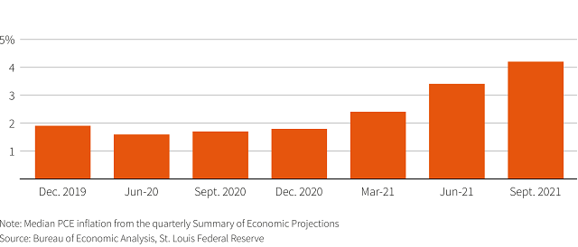 在3月16日至17日的政策会议上,美联储官员上调了2021年的通胀预期。鲍威尔在政策声明和经济预测发布后的新闻发布会上表示:“通胀水平出现相对温和的增长,这一涨势将是一次性的。预计当前的通胀水平在上升之后会再度回落。”然而,到9月份,通货膨胀率达到了美联储2%目标的两倍,官员们的预期值也更高了。