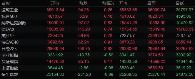 美股收盘情况:标普500指数上涨0.2%,报4613.67点;道琼斯工业平均指数上涨0.3%,报35913.84点;纳斯达克综合指数上涨0.6%,报15595.92点;纳斯达克100指数上涨0.4%,报15905.28点;罗素2000指数上涨2.7%,报2358.253点。