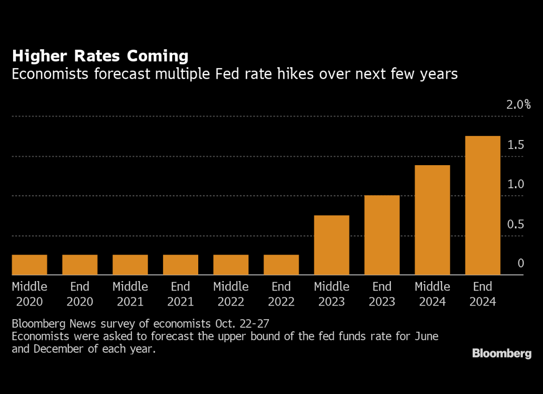 减码购债为2022年下半年可能的加息铺平了道路,18位官员中有9位在9月时预期美联储将于明年加息。 周三的政策声明重申,在经济实现充分就业前,利率将保持在零水平附近。