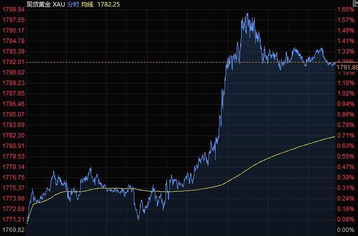 现货黄金收涨1.26%,报1792.04美元/盎司,录得三周来最大单日涨幅,美联储和英国央行表示,他们不急于升息。
