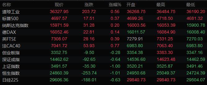 美股收盘情况:标普500指数上涨0.4%,报4697.53点;道琼斯工业平均指数上涨0.6%,报36327.95点;纳斯达克综合指数上涨0.2%,报15971.59点;纳斯达克100指数上涨0.1%,报16359.38点;罗素2000指数上涨1.4%,报2437.083点。