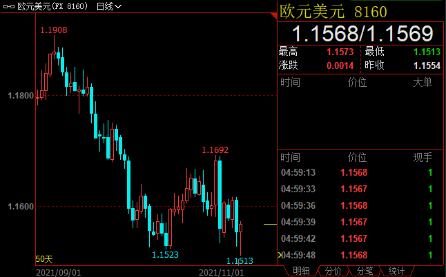 随着美元回吐涨幅了,欧元兑美元终盘收涨0.06%至1.1567,但汇价盘中触及2020年7月22日以来新低至1.1512。欧洲央行行长拉加德本周表示,欧洲央行明年升息的可能性非常小,因通胀仍过低,这推翻了市场对于早至明年10月升息的预期。
