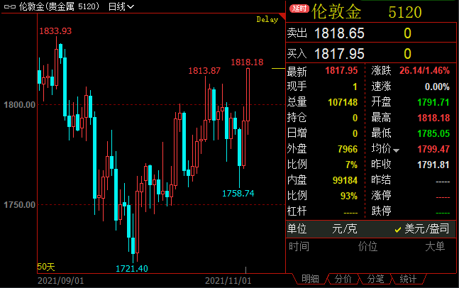 尽管通胀风险不断上升,但美联储和英国央行仍维持利率不变,增加了非孳息资产黄金的吸引力。现货黄金大幅收高1.97%至1817.95美元/盎司,盘中创9月7日以来新高至1818.18美元/盎司。美国10月就业增长强于预期,缓解了美联储被迫加速收紧货币政策的压力,美元指数在本周最后一个交易日承压收跌,但周线仍收涨0.08%至94.214。