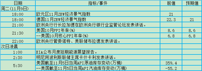 周二(11月9日)关键词:欧元区景气指数、美国PPI、拉加德、诺特、布拉德、卡什卡利