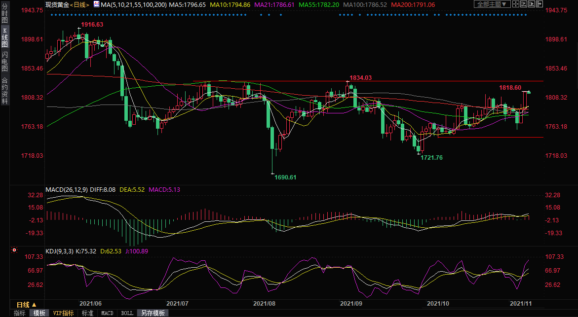 周一(11月8日)亚洲时段,现货黄金窄幅震荡于1810上方,守住了上周的大部分涨幅,上周因为美联储、英国央行和欧洲央行都释放了鸽派信号,帮助金价顶破了1800关口,并一度创近两个月新高至1818.38美元/盎司,调查显示,机构投资者和散户都倾向于看涨后市,金价本周有望进一步试探6月中旬以来的高点1834附近阻力。