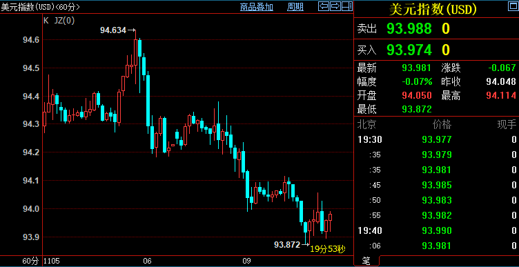 北京时间19:39,现货黄金上涨0.11%至1826.11美元/盎司;COMEX期金主力合约下沉0.03%至1827.5美元/盎司;美元指数下跌0.06%至93.992。
