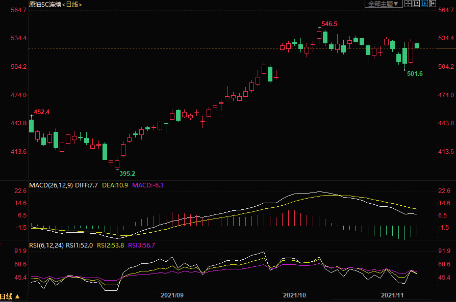 周二(11月9日)上海原油价格大涨,主力合约2112终盘收于524.9元/桶,涨2.7元/桶,涨幅0.52%,因美国基础设施法案获得通过、中国出口和全球疫后复苏均提振了燃料需求前景。