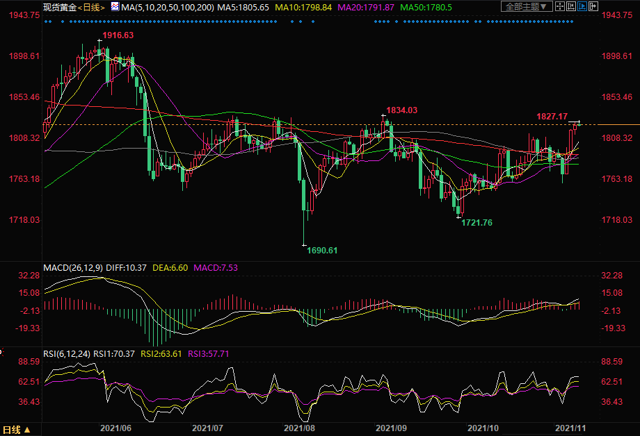 一旦金价拐头下行,初步支撑将是10月22日高位1813.82,再往下5日均线1805.57以及100日均线1790.91的支撑值得关注。