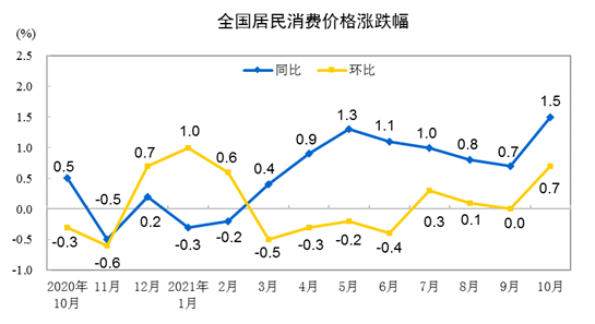 国家统计局周三数据显示,10月全国CPI(居民消费价格指数)同比上涨1.5%,环比上涨0.7%。PPI(工业生产者出厂价格指数)同比上涨13.5%,创纪录新高,环比上涨2.5%。市场人士称,近期保供稳价效果初显,预计PPI将迎来本轮周期的最高点,后续PPI与CPI的剪刀差将逐步收敛。