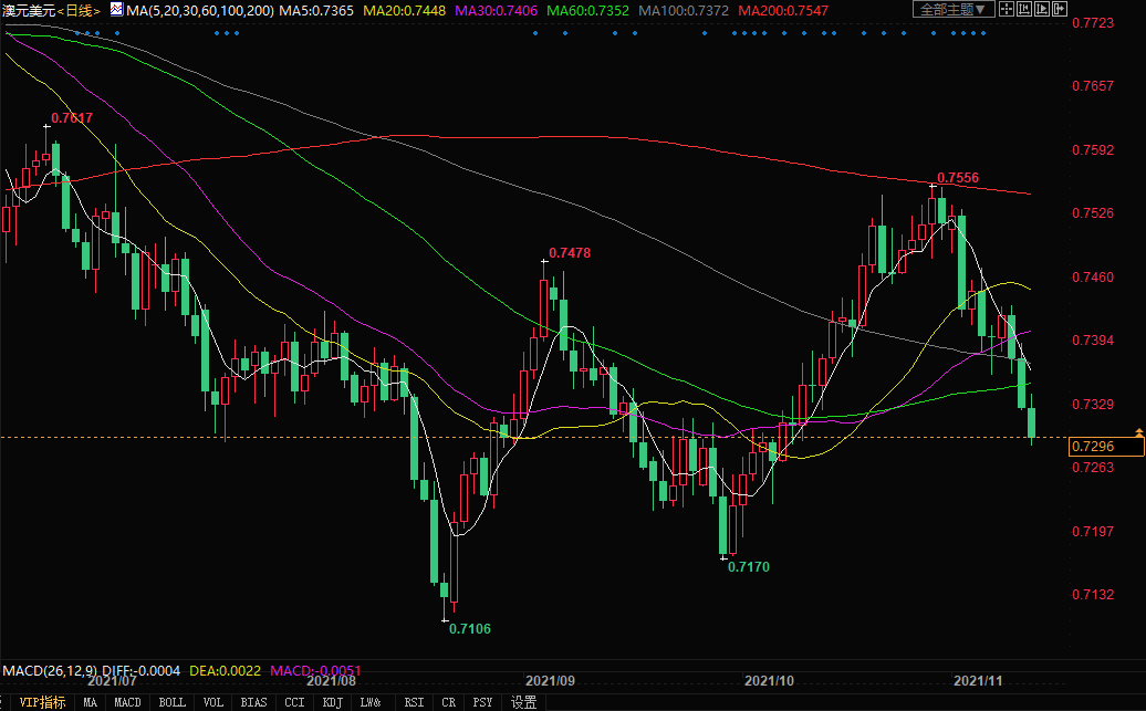 北京时间11月11日19:25,澳元兑美元报0.7296/98