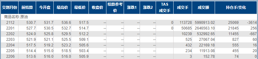 上海原油价格下跌,主力合约2112终盘收于519.3元/桶,跌11.4元/桶,跌幅2.15%。