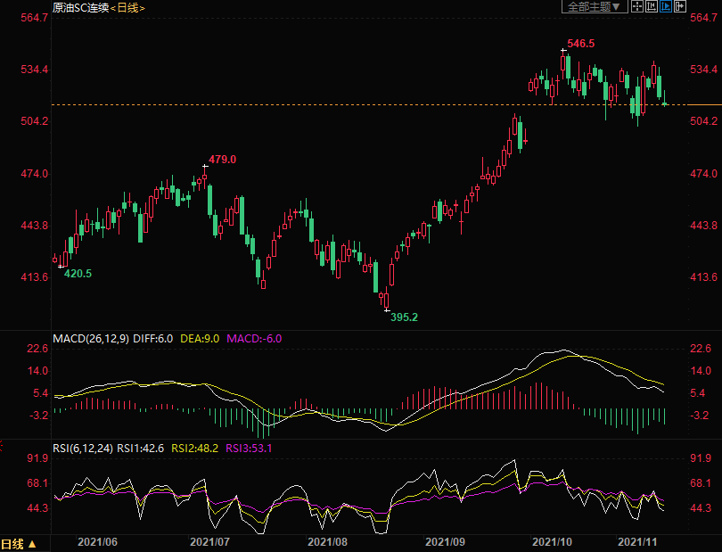 美国原油库存连续三周增长,国际油价大跌。美国能源信息署数据:上周美国商业原油库存增加100万桶。截止11月5日当周,美国原油日均产量1150万桶,与前周日均产量持平。美国总统拜登要求打压美国通胀水平,对油价也产生压力。欧佩克小幅下调今年石油需求增长预测,预计明年需求超过疫情大流行前水平。技术面,油价震荡转弱。操作建议:震荡偏空思路操作。
