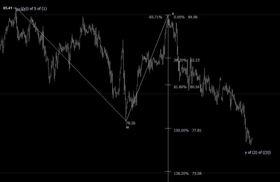 小时图上看,NYMEX原油处于自84.96美元开启的下行y浪,后市料跌向138.2%目标位75.08美元。y浪是自85.41美元开启的调整(2)浪的子浪。(2)浪是自61.74美元开启的上行((3))浪的子浪。