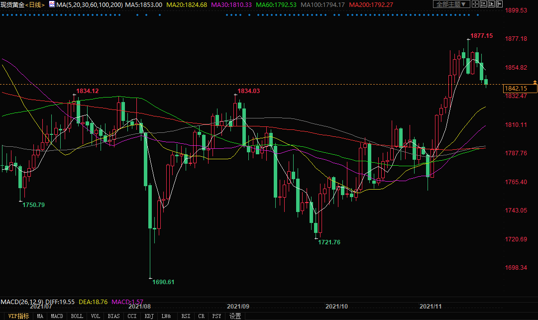 北京时间11月22日14:49,现货黄金报1842.15美元/盎司。