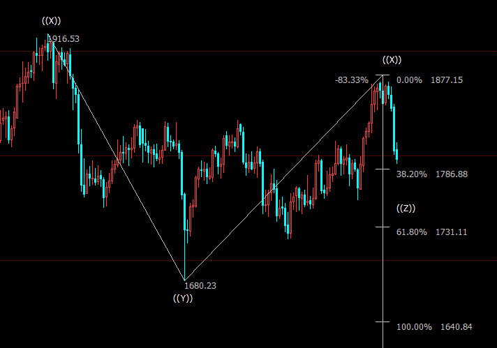 日线图上看,金价处于自1877美元开启的下行((Z))浪,料跌破38.2%目标位1787美元,并进一步下探61.8%目标位1731美元。((Z))浪是自2075美元开启的调整IV浪的子浪。