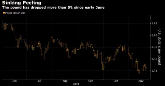 这种悲观情绪可以归结为对英国国内和国际挑战的混合因素。有迹象显示,美联储将加快缩减其紧急刺激计划,英镑因此受到美元看涨情绪的影响。与此同时,人们对英国央行是否会在12月加息表示怀疑,甚至担心紧缩政策会损害经济复苏。