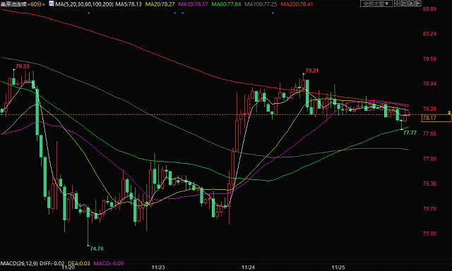 北京时间11月25日20:20,美原油期货价格报78.17美元/桶。