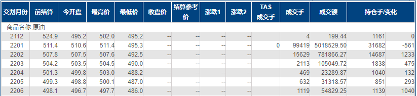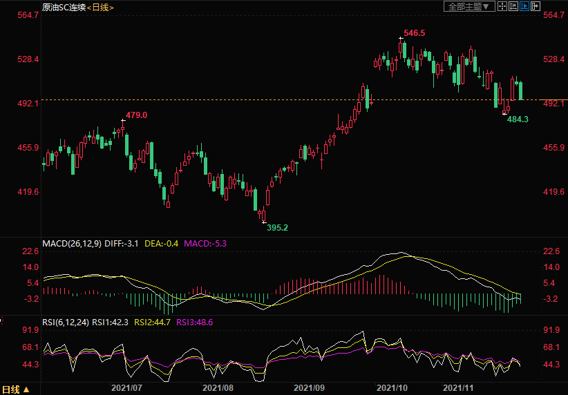 上海原油价格大跌2.95%,主力合约2201终盘收于496.3元/桶,跌15.1元/桶。