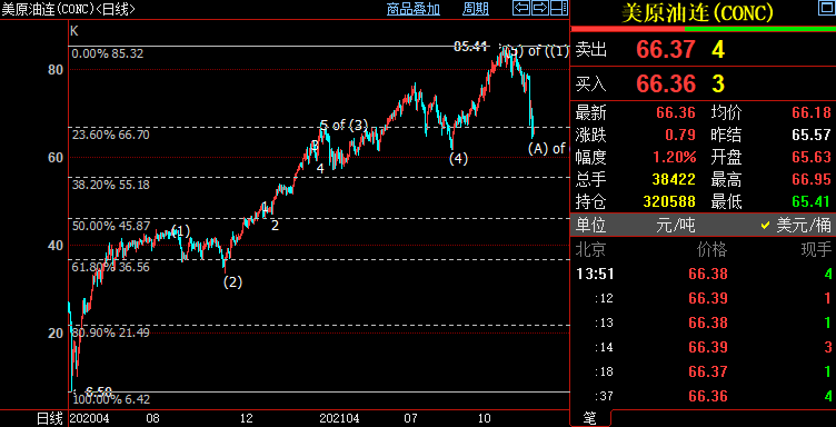日线图上看,NYMEX原油处于自85.41美元开启的调整((2))浪中,跌破66.79美元,后市料下探55.27美元,它们分别是自6.5美元开启的上行((1))浪的23.6%和38.2%斐波那契回档位。((2))浪料细分为(A)-(B)-(C)三子浪结构,目前处于其中的(A)浪。