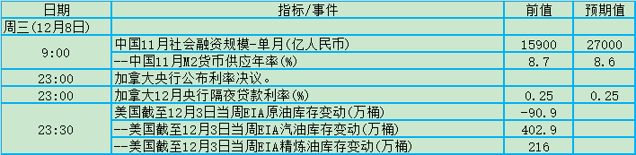 周三(12月8日)关键词:中国社融、加拿大央行决议、EIA库存