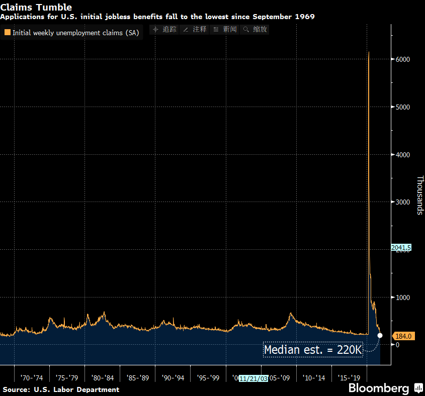 美国上周首次申请失业救济人数降至1969年以来最低水平,凸显出对数据进行季节性调整的难度。美国劳工部周四发布的数据显示,截至12月4日的一周,首次申领失业救济人数比前一周减少4.3万,至18.4万人。接受彭博调查的经济学家中值预期为22万人。