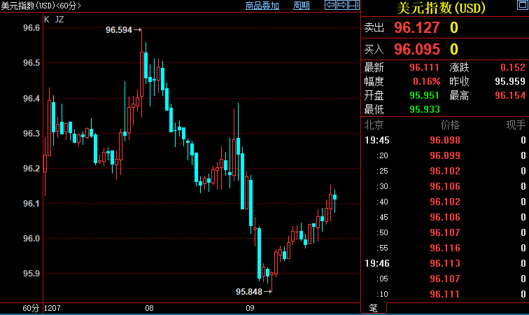 北京时间19:45,现货黄金下跌0.10%至1781.24美元/盎司;COMEX期金主力合约下跌0.20%至1781.9美元/盎司;美元指数上涨0.23%至96.116。