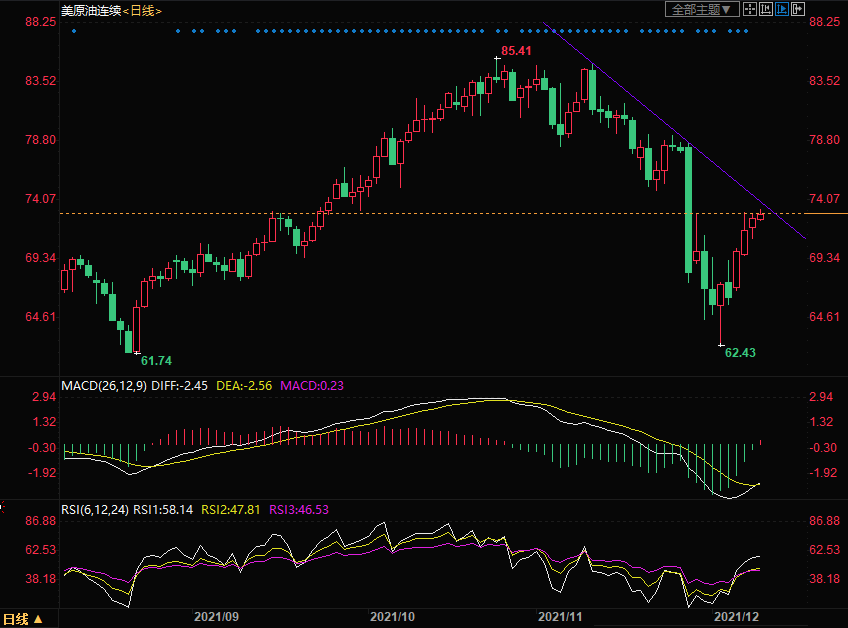 周四(12月9日)美原油小幅上涨,油价上方遭遇趋势线压力,冲高回落风险加大,建议保守者观望,激进者逢高做空。