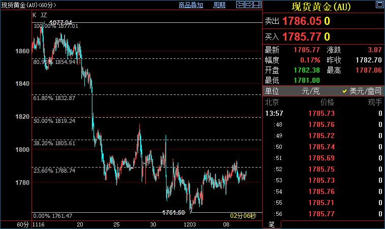 北京时间13:59,现货黄金上涨0.17%至1786.00美元/盎司;COMEX期金主力合约上涨0.07%至1786.8美元/盎司;美元指数上涨01.4%至96.037。