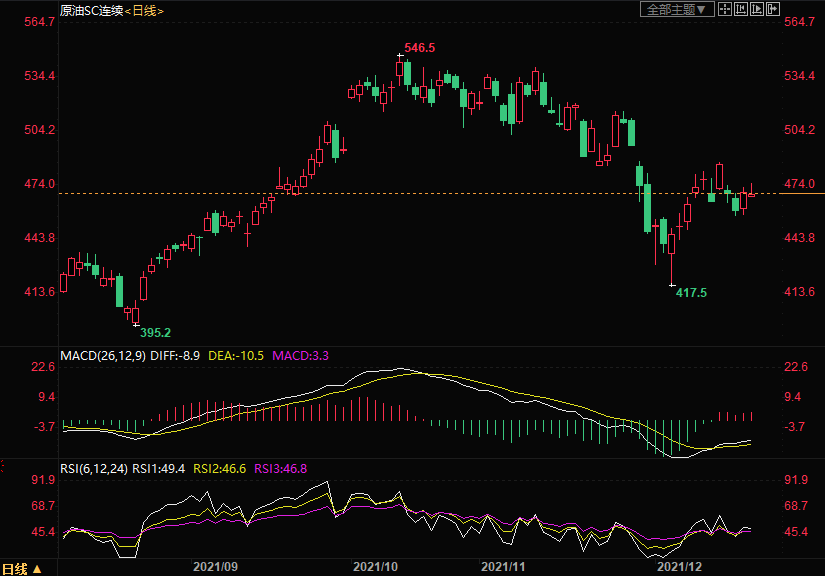上海原油价格上涨1.23%,主力合约2202终盘收于469.2元/桶,涨5.7元/桶。