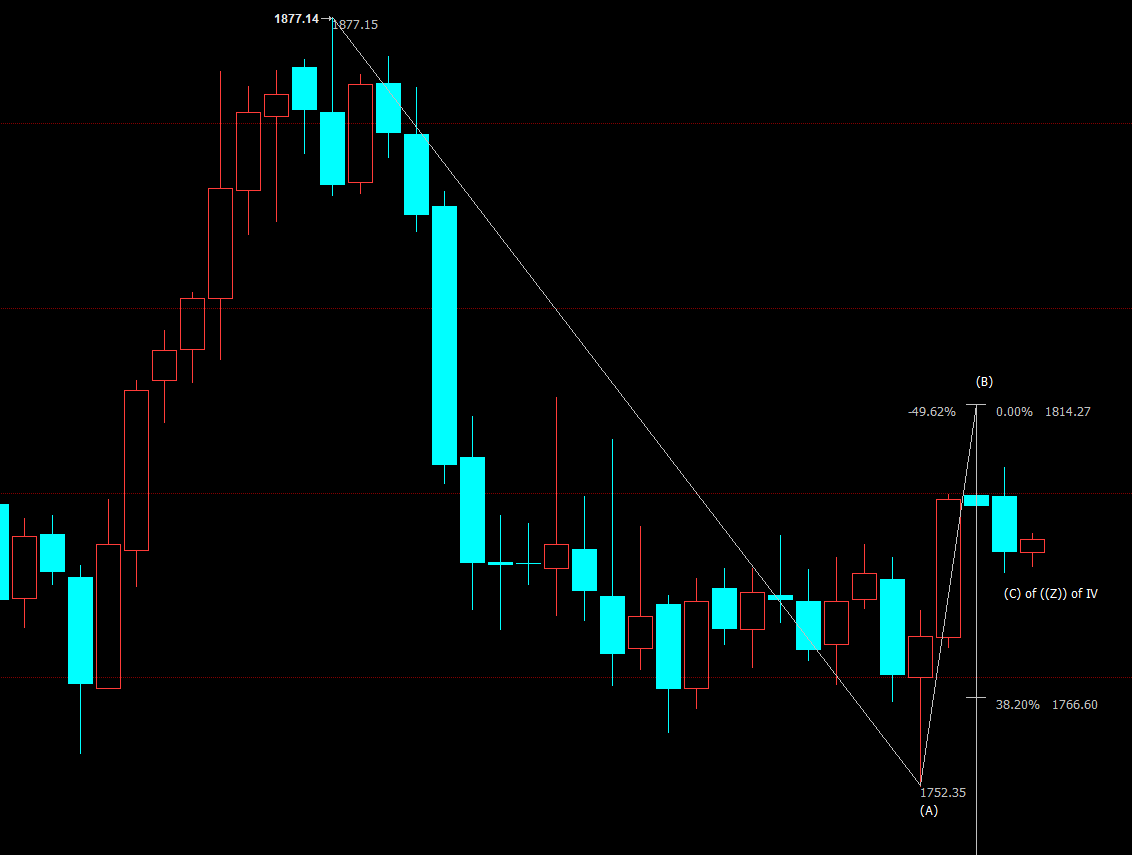 日线图上看,金价自1815美元开启下行(C)浪走势,下方支撑看向23.6%目标位1785美元。(C)浪是自1877美元开启的下行((Z))浪的子浪,((Z))浪则隶属于自2075美元开启的调整IV浪。