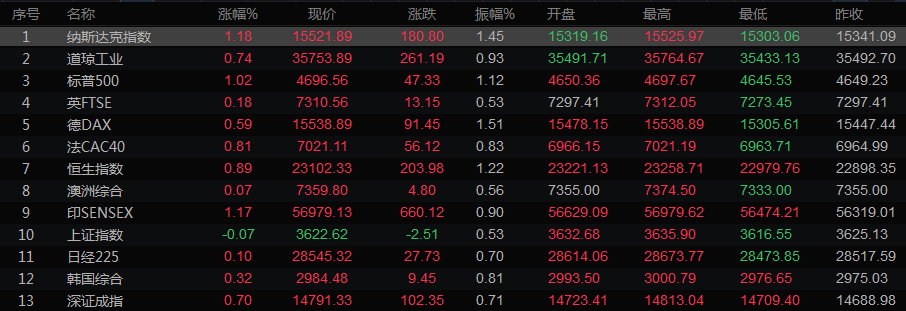 美国股市方面,道琼斯工业指数上涨261.19点,或0.74%,至35753.89点;标普500指数上涨47.33点,或1.02%,至4696.56点;纳斯达克指数上涨180.81点,或1.18%,至15,521.89点。