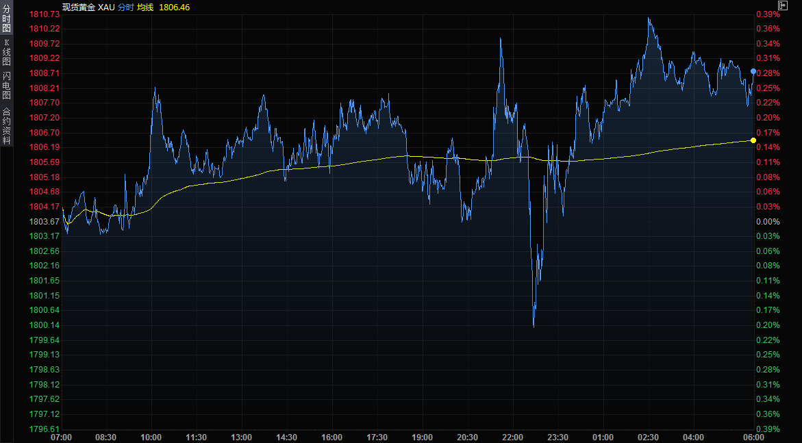 因美元小幅走弱、通胀预期高企和疫情担忧,现货黄金小幅走高,收报1808.80美元/盎司;纽约商品交易所2月份交割的黄金期货上涨0.5%,结算价报1811.70美元。