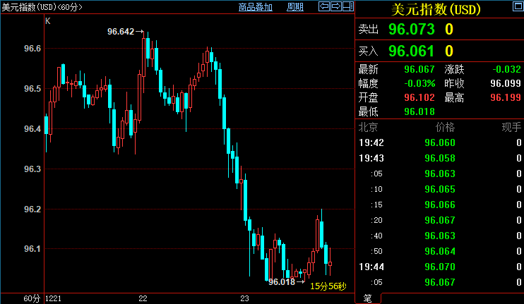 北京时间19:43,现货黄金上浮0.08%至1805.14美元/盎司;COMEX期金主力合约上涨0.21%至1806.0美元/盎司;美元指数上浮0.01%至96.064。