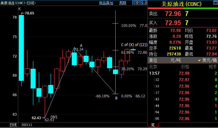 日线图上看,NYMEX原油自66.12美元开启上行C浪走势,升破61.8%目标位72.86美元,后市料上摸76.4%目标位74.46美元。C浪是自62.43美元开启的反弹(X)浪的子浪。(X)浪则是自85.41美元开启的调整((2))浪的子浪。