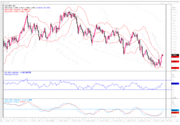 美国11月核心PCE物价指数年率最新值4.7%,前值4.2%,再次显著增长。美国的高通胀问题仍在延续,预计美联储在2022年一季度之前不会改变快速增加缩减每月购债的计划。美元指数在(95.5-97)区间内高位震荡,在经历种种利多提振后,上行动能明显被透支。英国央行率先加息,鹰派立场明显,英镑买入情绪高涨。GBPUSD连续三日大涨,趋势转折特征显著。下方支撑位在1.316,上方短期阻力位1.337已经被突破,下一阻力位在1.3510位置。但小时以及4小时短线图上,出现超买和顶背离迹象,须谨慎冲高获利调整回落的风险。