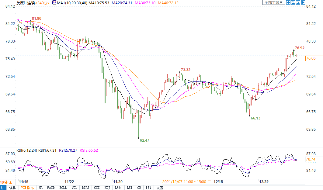 越来越多迹象显示omicron的症状比前几代毒株温和,美国将感染者隔离时间缩短一半,英国排除了新年前推出更多限制措施的可能性。Price Futures Group Inc.高级市场分析师Phil Flynn表示,市场对实施防疫封锁和经济活动限制的担忧正在减退。