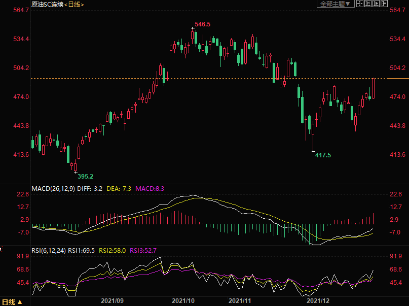 周二(12月28日)上海原油价格大涨3.87%,创一个月新高,主力合约2202终盘收于494.0元/桶,涨18.4元/桶,市场预期Omicron新冠病毒变体对全球需求的影响有限,即便新冠病例激增导致航班取消。