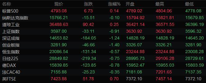 美股收盘情况:标普500指数上涨0.1%,报4793.06点;道琼斯工业平均指数上涨0.3%,报36488.63点;纳斯达克综合指数下跌0.1%,报15766.22点;纳斯达克100指数基本持平,报16491.01点;罗素2000指数上涨0.1%,报2247.635点。